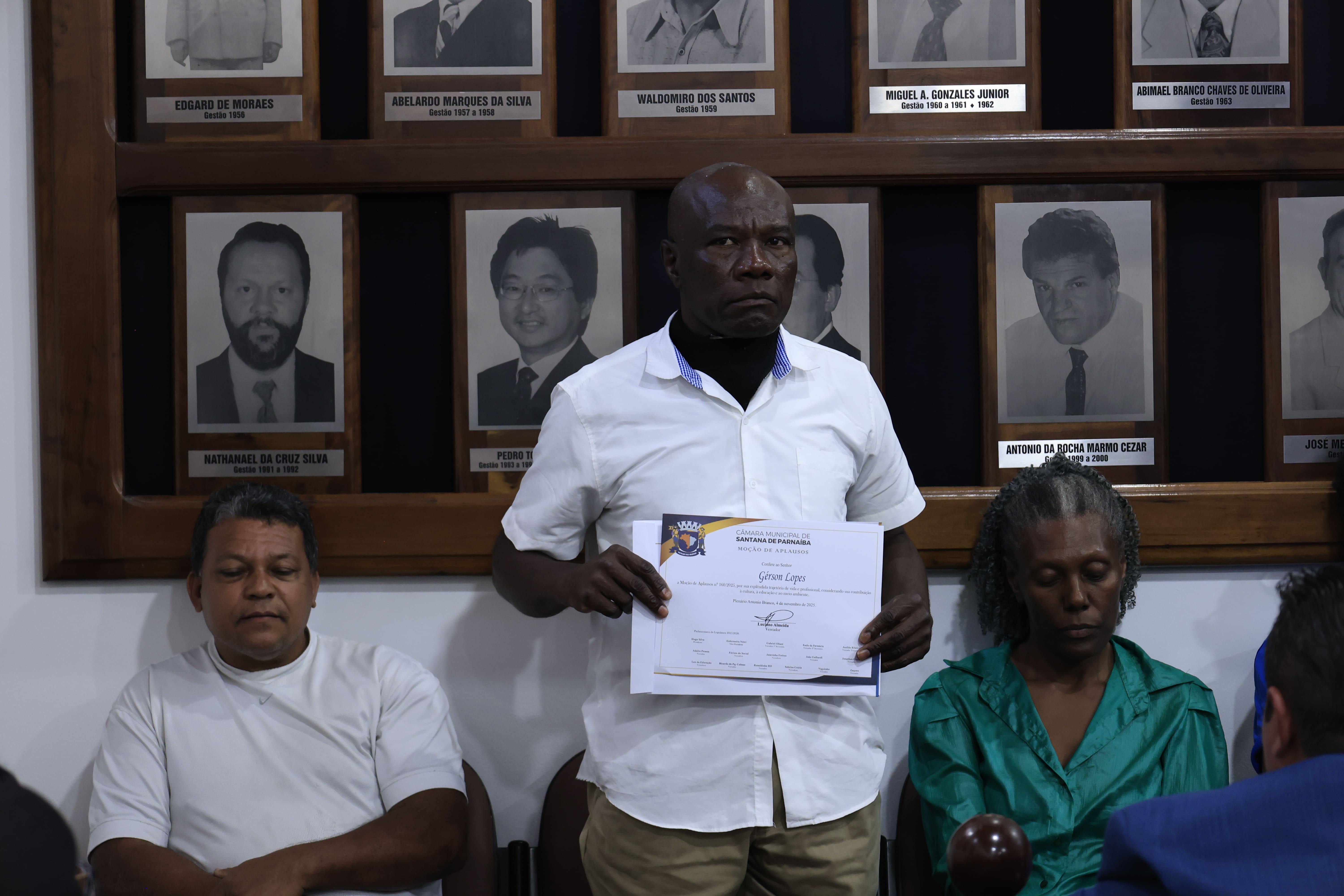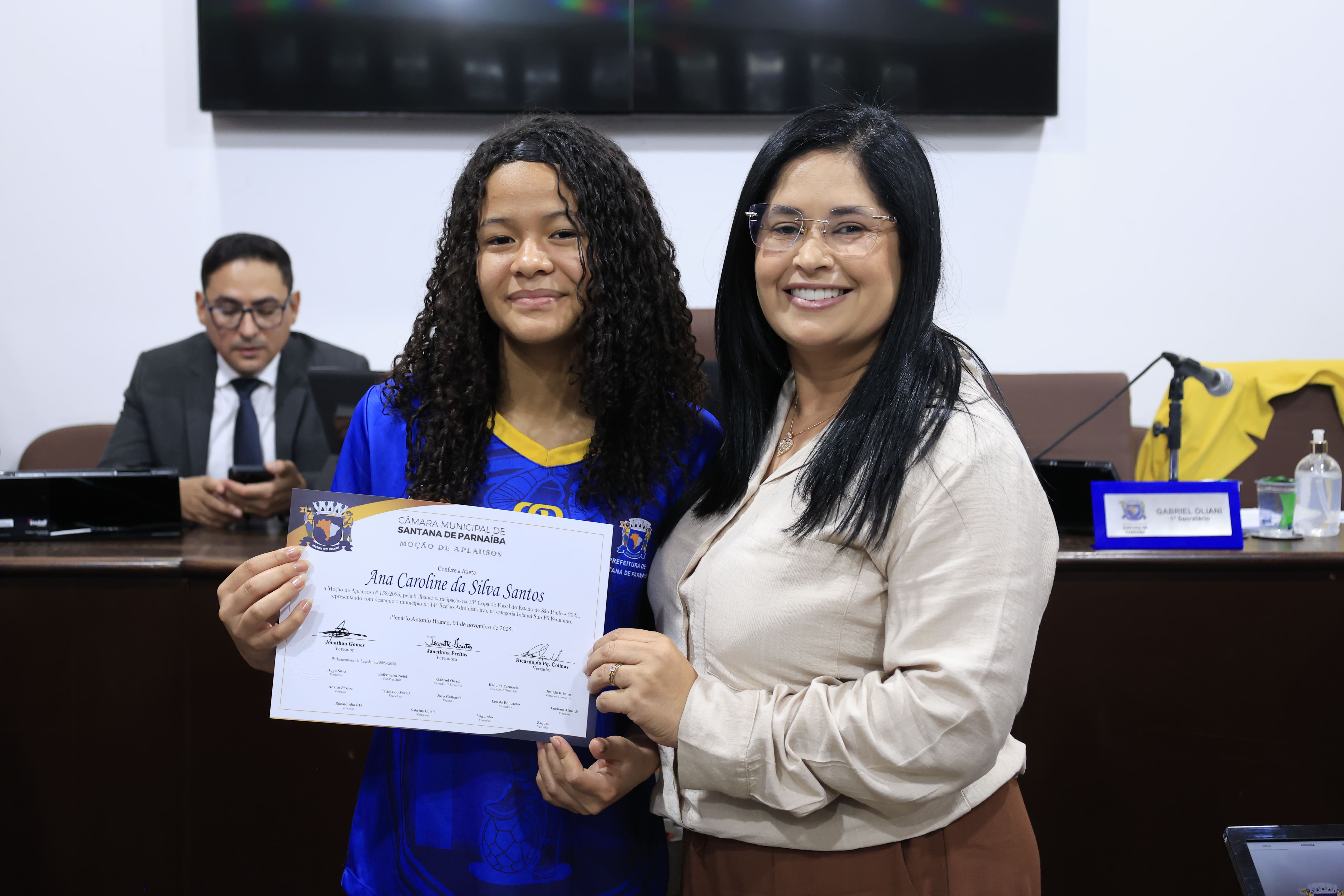 A sessão contou ainda com a entrega de Moções de Aplausos e reconhecimento a pessoas e instituições que se destacam por suas contribuições à cidade e à região. Foram homenageados: o Município de Mairinque (SP), pelos 135 anos de emancipação política; a equipe de futsal feminino Sub-16 de Santana de Parnaíba, pela brilhante participação na 13ª Copa de Futsal do Estado de São Paulo – 2025; a senhora Solange Santana da Cruz e o time MAMUTS F.F.C., pela realização da Festa do Mês das Crianças e ao senhor Gérson Lopes, por sua contribuição à cultura, à educação e ao meio ambiente.