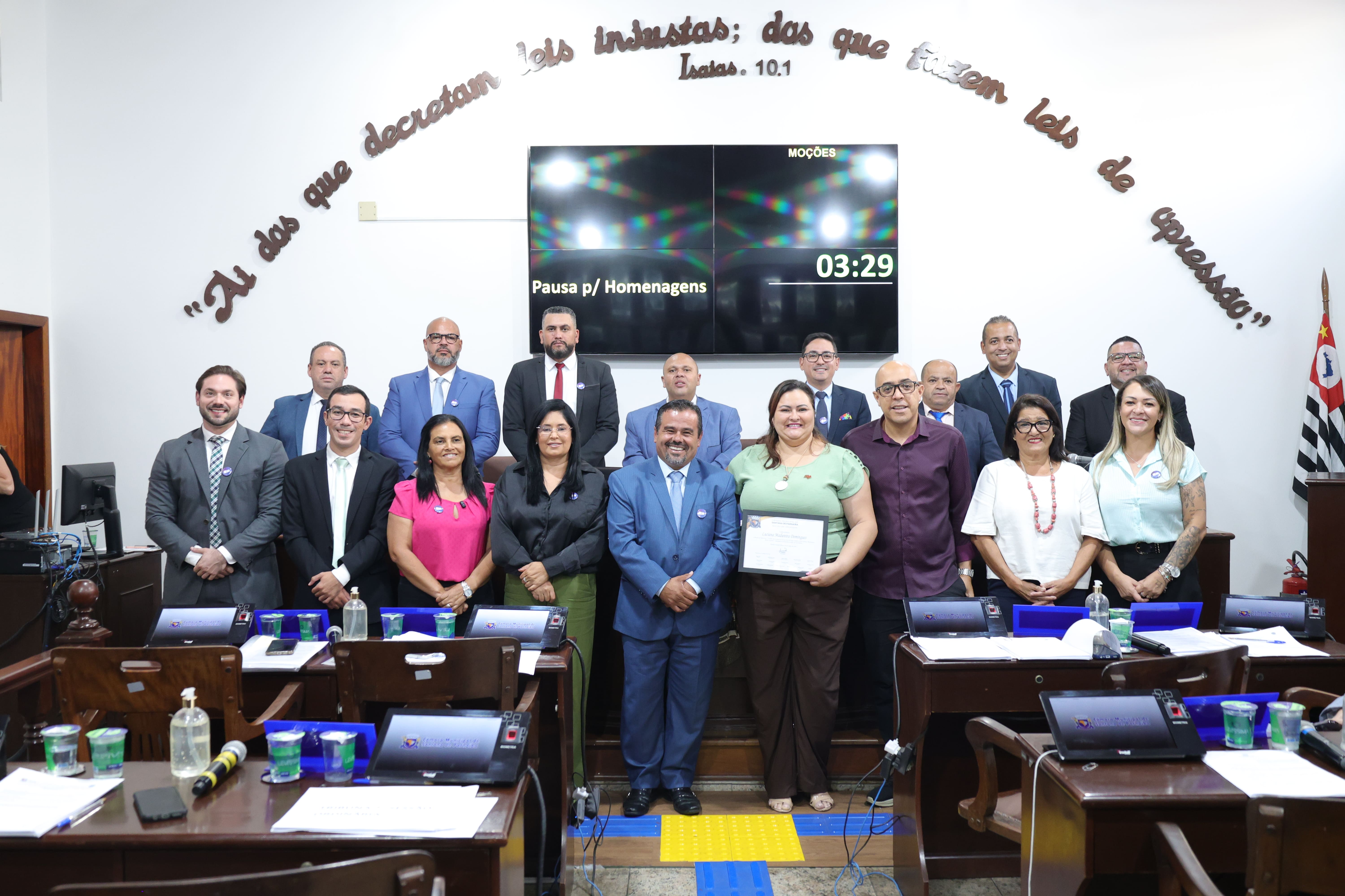 Foram aprovadas moções em reconhecimento a personalidades que se destacam por sua contribuição à sociedade. Em texto conjunto, os vereadores prestaram Moção de Aplausos à Sra. Luciana Madureira Domingues, em reconhecimento ao seu relevante trabalho à frente da Etec Bartolomeu Bueno da Silva – Anhanguera, além de homenagear a artesã Ângela Machado, em comemoração ao Dia do Artesão, celebrado em 19 de março, destacando a importância da valorização da cultura e do trabalho artesanal no município.