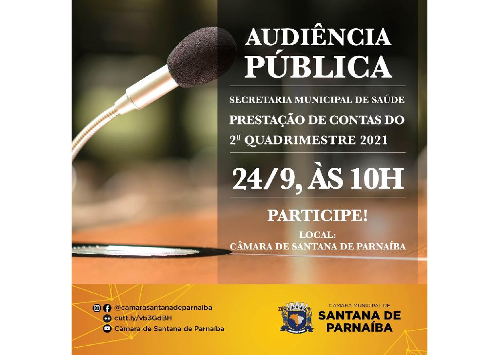 Nos dias 24 e 30 de setembro, à 10h, serão realizadas, no plenário Antonio Branco, da Câmara de Santana de Parnaíba, mais duas audiências públicas deste ano com as secretarias municipais de Saúde e de Finanças