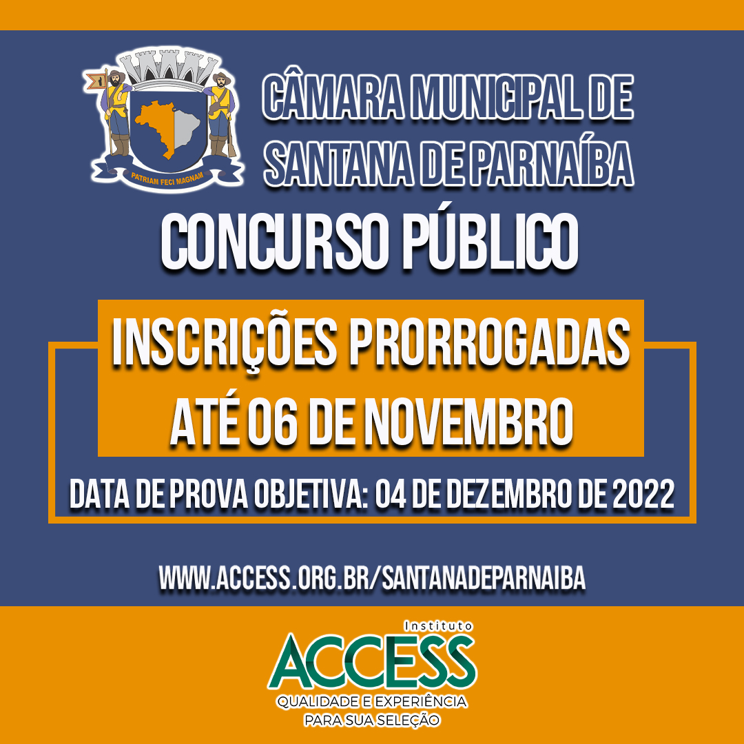Realizado sob a responsabilidade do Instituto de Acesso à Educação, Capacitação Profissional e Desenvolvimento Humano – Instituto Access, o concurso público da Câmara de Santana de Parnaíba teve suas inscrições iniciadas em 5 de setembro, às 14h, e se estenderão até 6 de novembro, às 23h59.