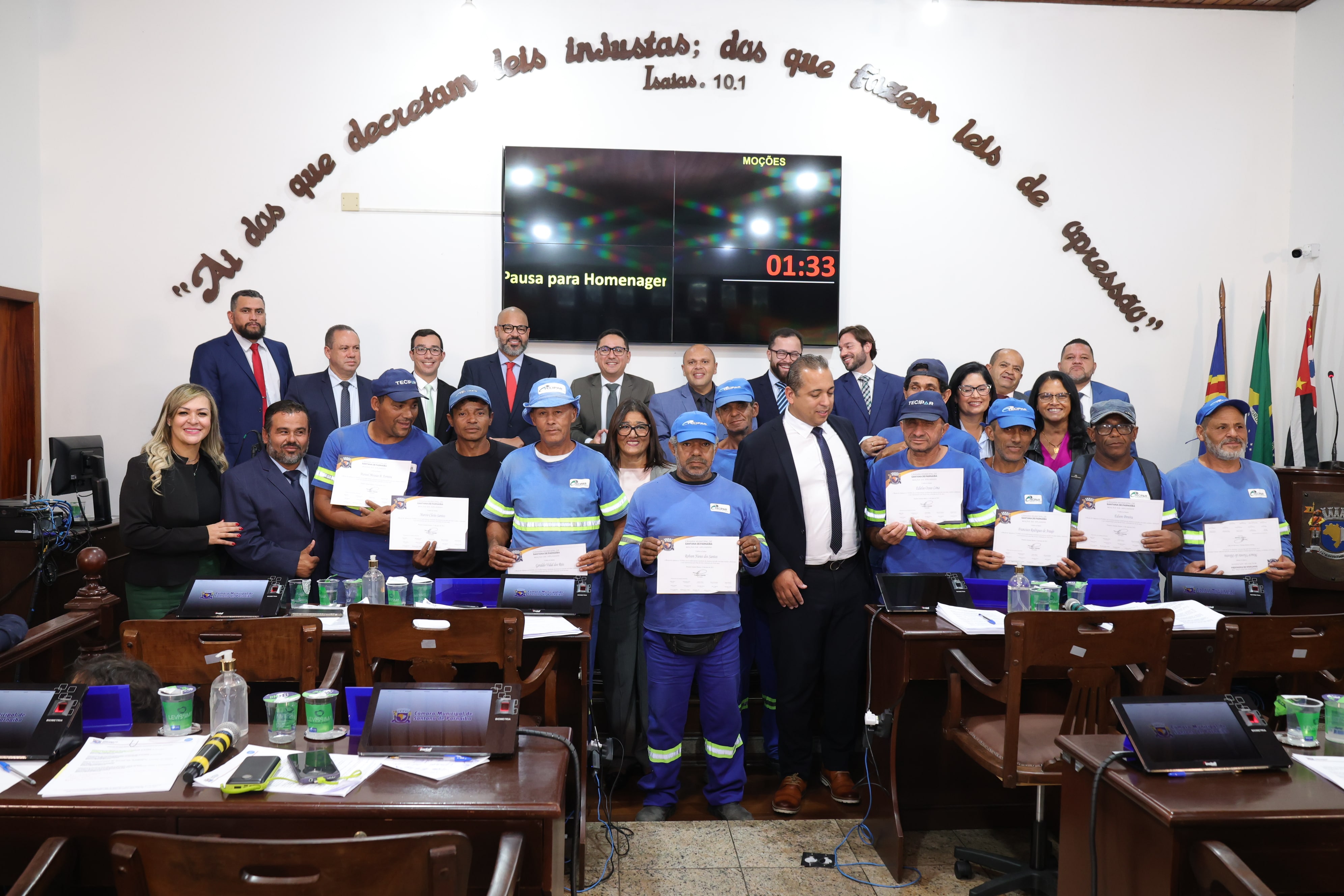A sessão também foi marcada por homenagens a cidadãos e instituições que vêm contribuindo de maneira significativa para o desenvolvimento social e cultural do município. Foram entregues Moções de Aplausos à estudante Ana Vitória Lima dos Santos Soares, pelo destaque no Concurso Cultural da Jornada Literária 2025; ao ex-vereador Agnaldo Moreno, em reconhecimento à sua trajetória de vida e aos serviços prestados à cidade durante sua vereança; aos valorosos garis que atuam em Santana de Parnaíba, em alusão ao Dia do Gari, celebrado em 16 de maio, como forma de reconhecimento à importância do trabalho que realizam diariamente; ao time BRASOK, por sua brilhante trajetória no esporte e relevante atuação social no município; à Clínica Evolve, pela celebração dos seus três anos de fundação; e a todos os enfermeiros e enfermeiras, especialmente os que atuam em Santana de Parnaíba, em reconhecimento ao trabalho essencial e incansável que desempenham em prol da saúde da população.