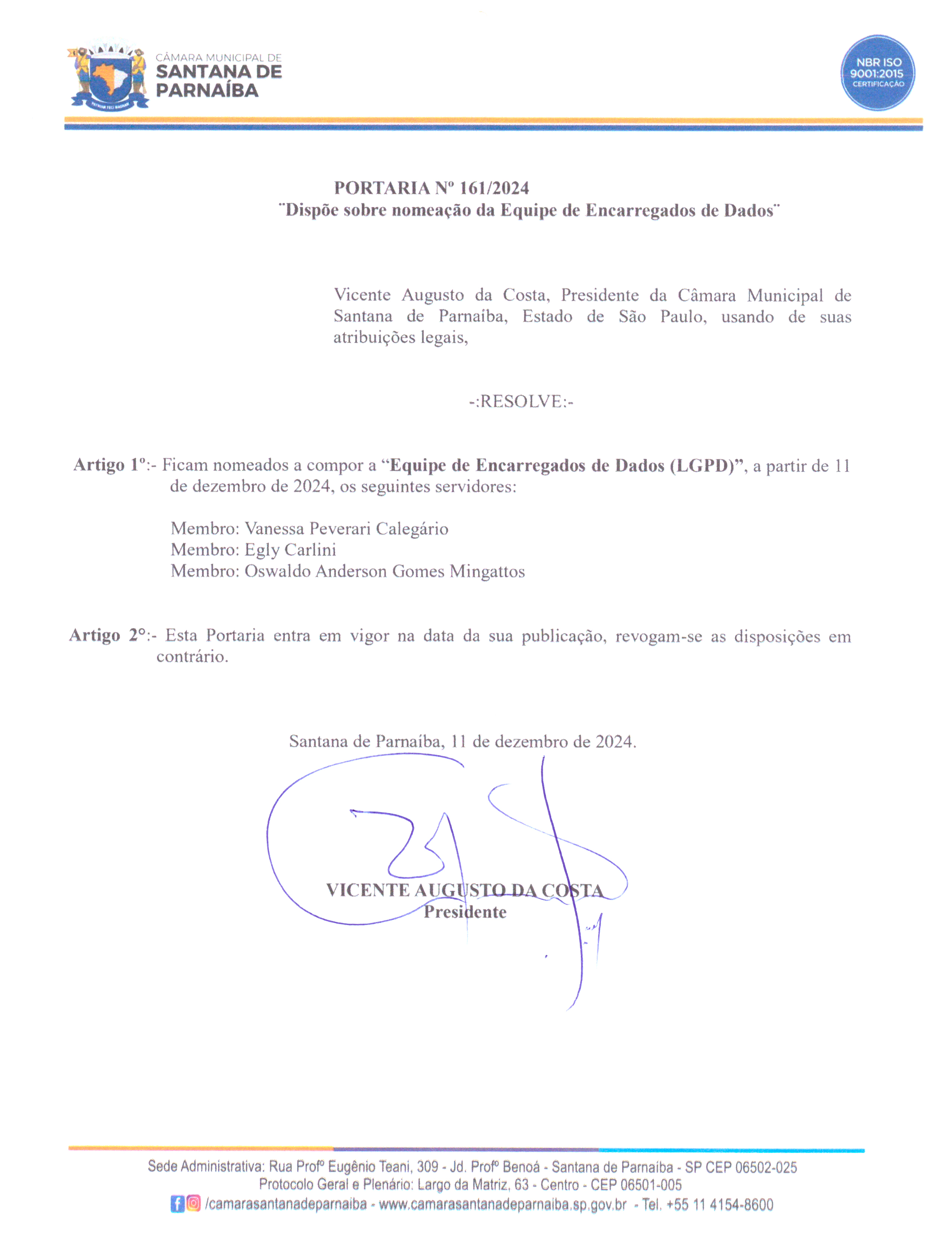 Em cumprimento à referida legislação, a Câmara Municipal de Santana de Parnaíba, por meio da Portaria nº 161/2024, instituiu a Equipe de Encarregados de Dados, composta pelos seguintes membros: