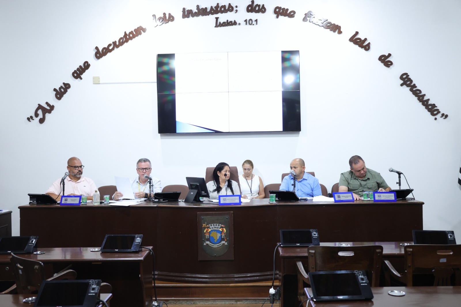A reunião foi conduzida pela Comissão de Orçamento, Finanças e Contabilidade, composta pela presidente, vereadora Jeanette Costa de Freitas; pelo vice-presidente, vereador Reinaldo Alcebíades Gama; e pelo membro, vereador Vagner Augusto Costa. A comissão contou ainda com a presença do vereador Adalto Pessoa.